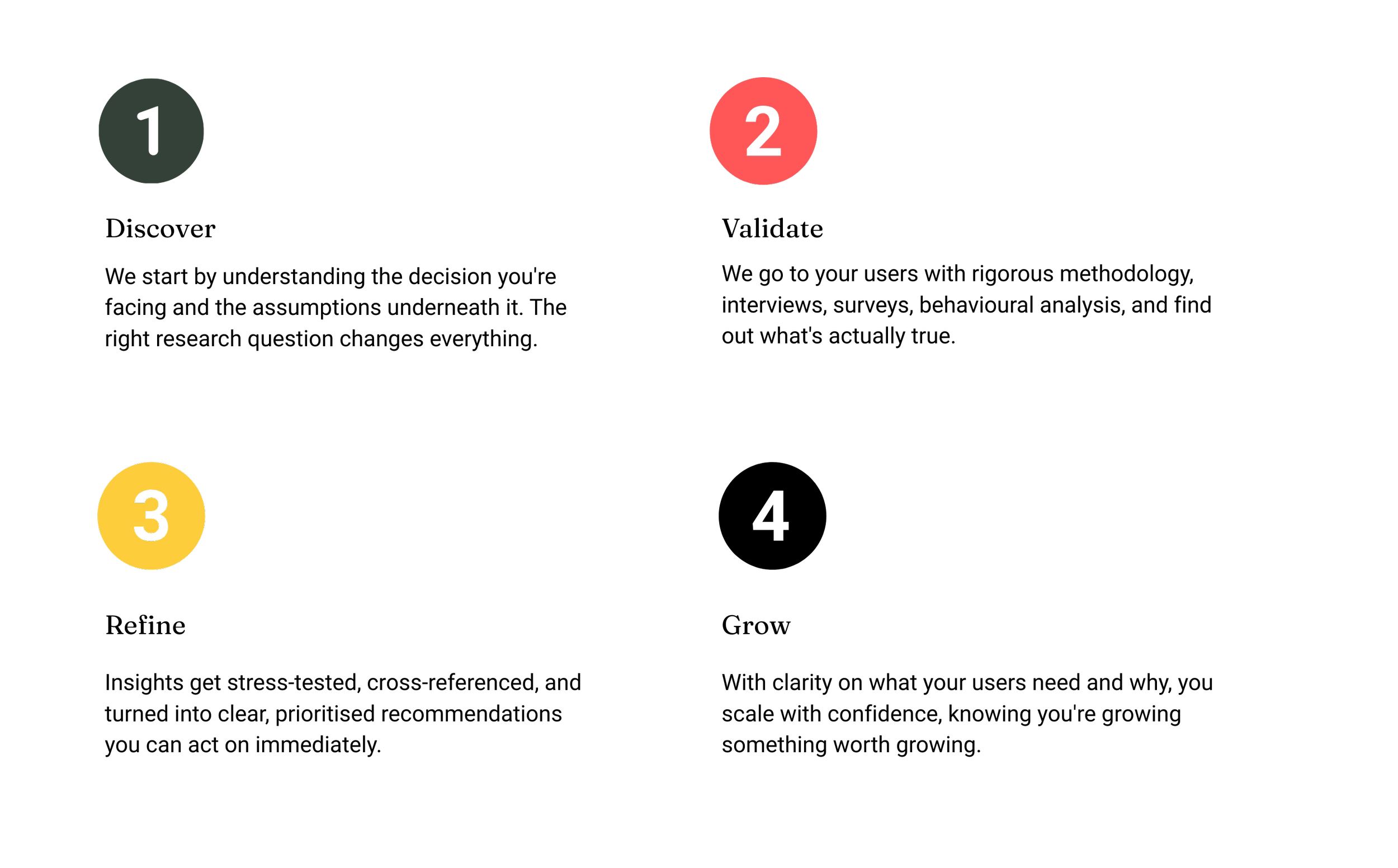 When you work with us, you're working with a researcher who has led studies for platforms with over a million users, built full mixed-methods validation programmes from the ground up, and understands what it actually takes to translate research into decisions people act on.